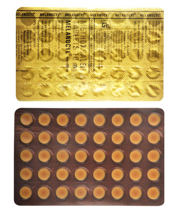 - Dawkowanie dla łuszczycy: 0.6 mg/kg wagi ciała, podawane na 1.5-2 godziny przed naświetlaniem UVA.